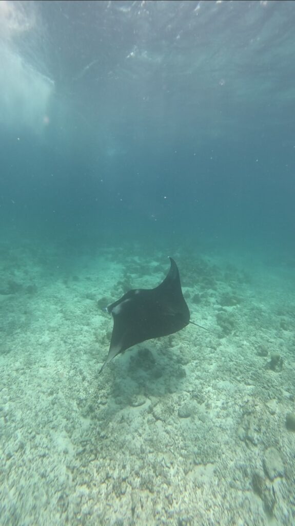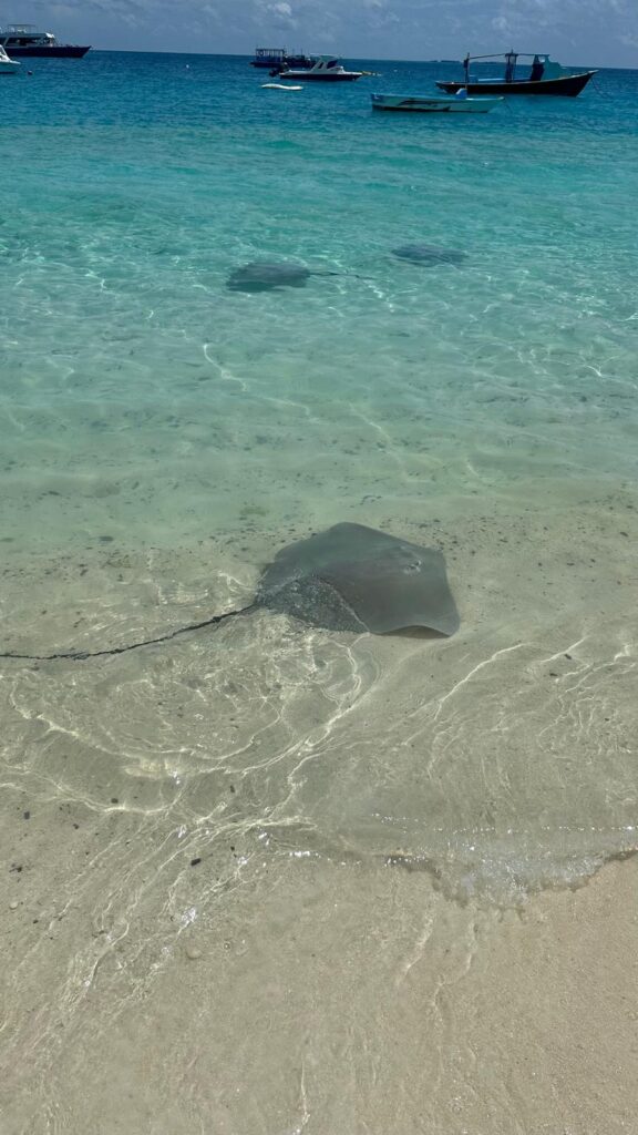 Cestou jsme se pokoušeli najít manty (bohužel jsme viděli jen jednu v hloubce, která nám hned uplavala) a výlet jsme zakončili na ostrově Fulidhoo, kde jsme při obědě pozorovali rejnoky přímo u břehu.